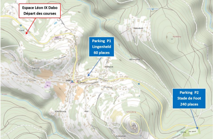 Parking 2 sur la D45 ancien stade de foot 240 places, terrain en schiste praticable même en cas de pluie. (48°38'56.8"N 7°15'19.0"E) - plan